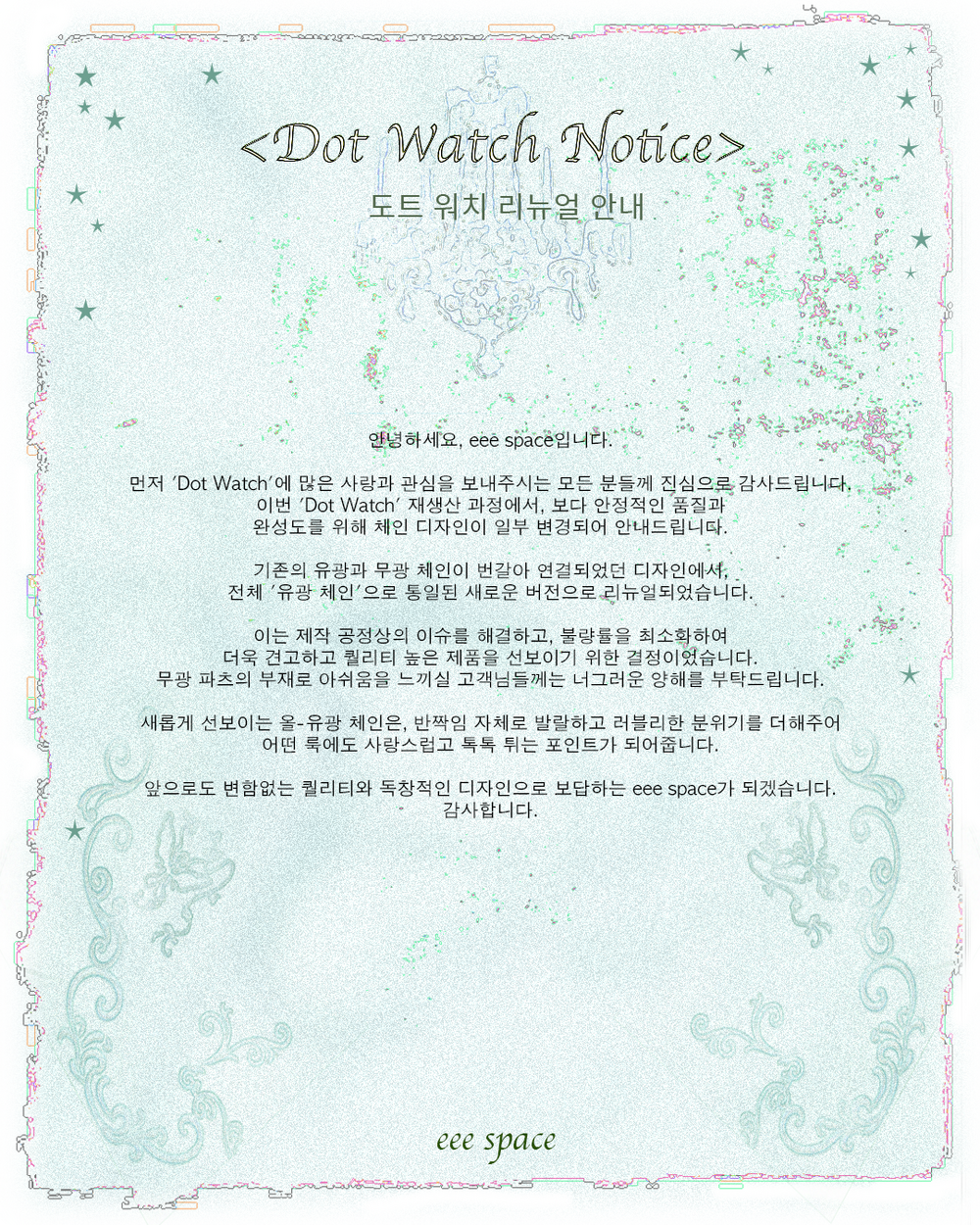 • 시계 내부에 습기가 차는 경우가 간혹 있습니다. 해당 현상은 건조 과정에서 자연스럽게 소실되는 일시적인 특성으로, 제품의 기능이나 품질에 영향을 미치지 않으며 불량에 해당하지 않습니다.